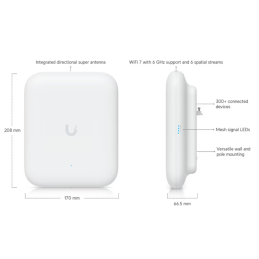 Este access point está pensado para entornos exteriores exigentes donde se necesita Wi-Fi de alta capacidad y cobertura amplia, como patios, terrazas, parques, estadios pequeños o zonas públicas, ofreciendo gestión y funciones avanzadas de red desde UniFi Network con hardware preparado para intempéries.
